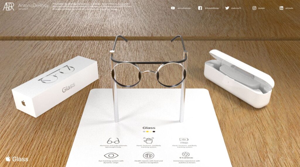 Apple Glass is made of aluminum and polycarbonate, for a lightweight body. It offers 2 days of battery life and has an eye tracking system with dynamic range. What’s missing here is the UI and overlay on top of the reality around. The interface could make or break the product and I’m curious to see how much it borrows from iOS, watchOS or other OSes.
